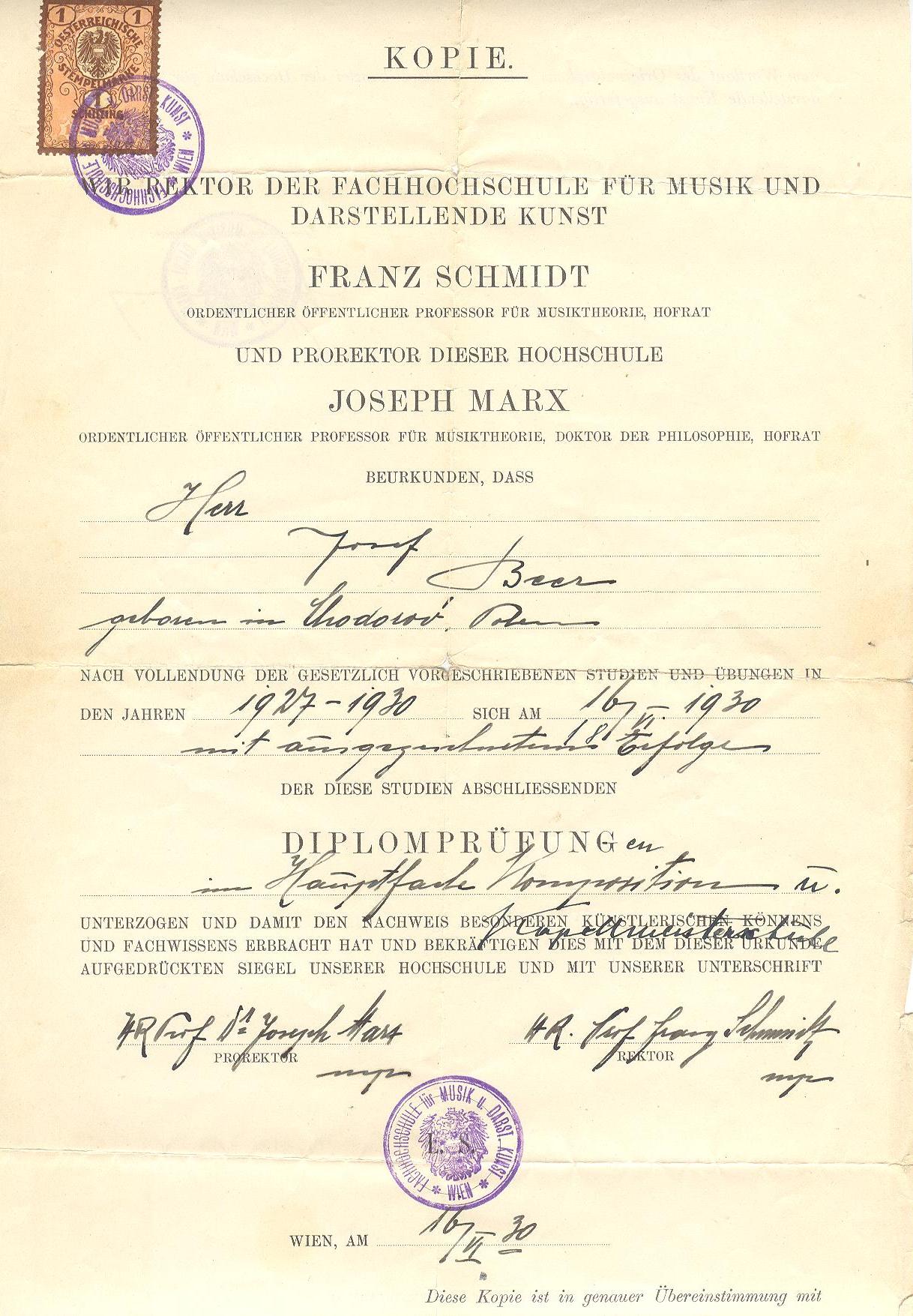Joseph Beer's graduating diploma from