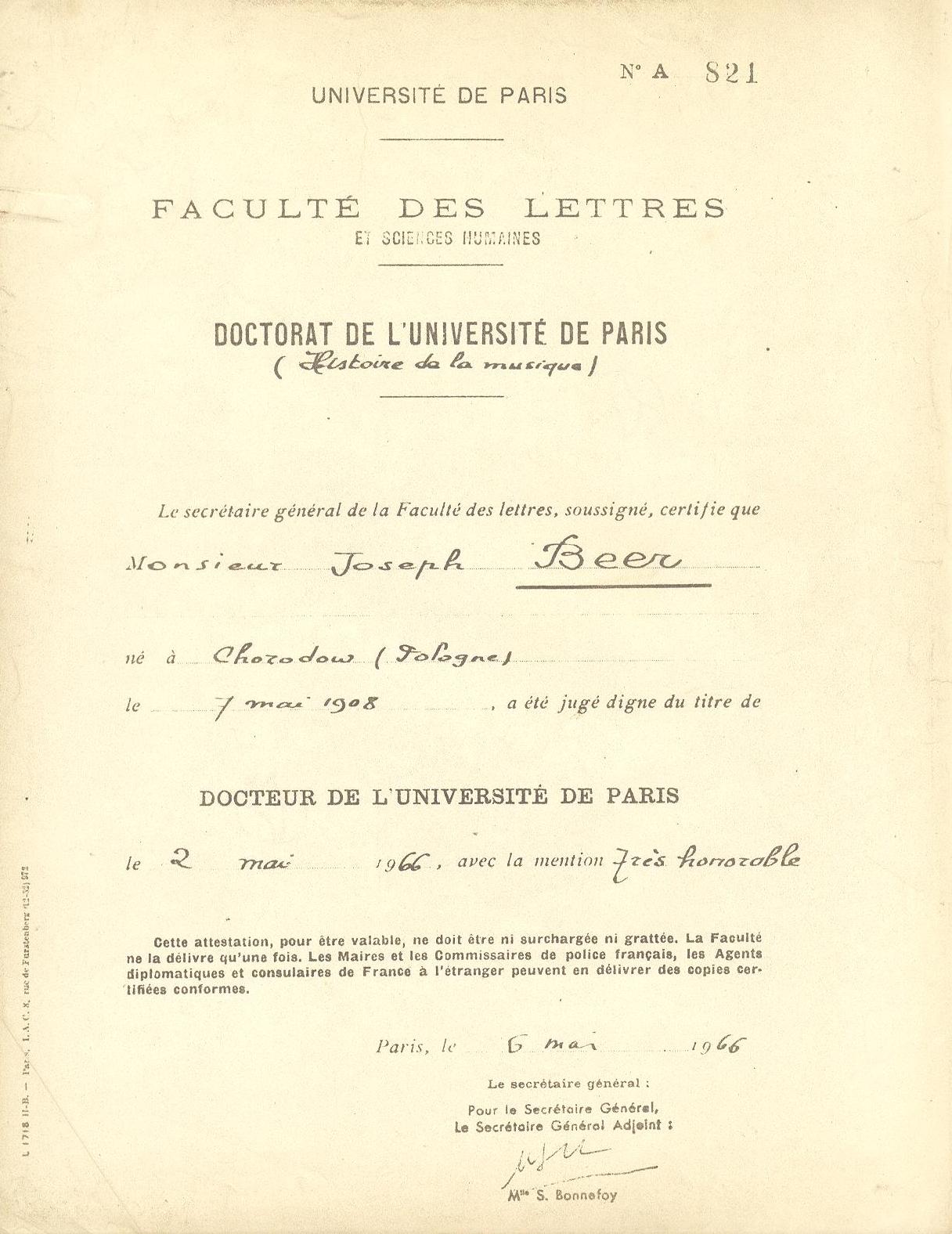 Joseph Beer's doctoral diploma from the Sorbonne